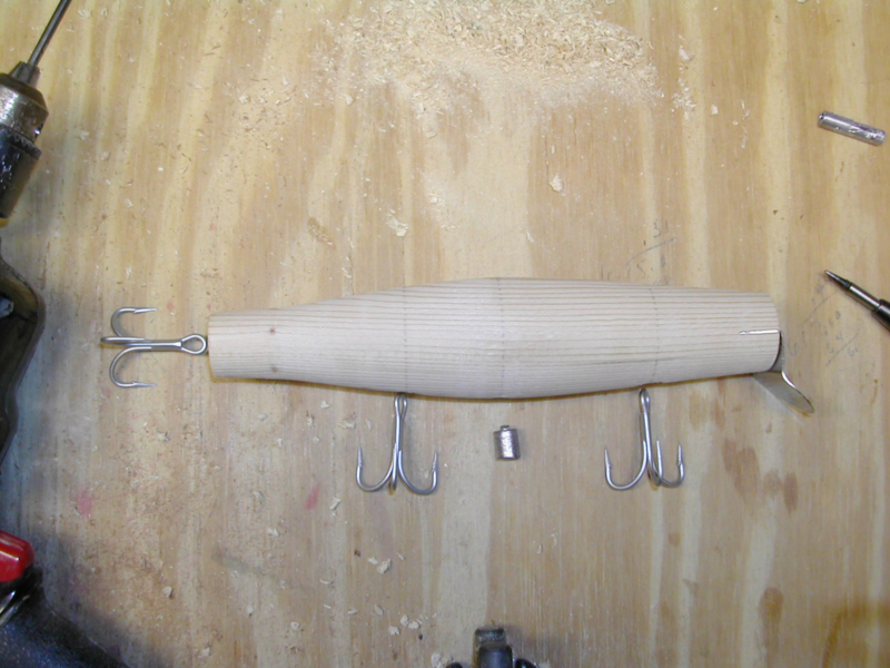 I know lots of guys work off a template when the build a plug.an thats good if'n u wanna make a hole bunch an weed thru the not so good ones.I don't have a duplicator so i do most of my work by selective posistioning of hook holes weight an so forth.Here's what i do I will spin a blank an put the hooks where i think they will work best with the size of the hook an weight balancing as the determining factors.I always have some scrap wire lyin around so i string em up an try to balance the plug in the middle thats where the weight goes. Sometimes I will put it just back of that center 1/8" to give it a little casting Balance. This will keep it from tumbling as much an lessen the chance of hook fouling on the line.Now someytimes in a plug that size I will go wit a 5/0 on the front an a 4/0 on the back wit just tail feathers on the tail no hook.or 2-5/0's an no tail hook.Or a 4/0 front 3/0 rear u get the idea.I like to mix it up.Don't be pigeon holed into thinkin this hook goes on this plug.Use the hooks as a tool just like u would a certain lure for a certain situation.If I find a shape that works I work off the weight,the single most important thing is the weight.I can vary from one piece of wood to another an perhaps is the main reason some plugs work an some are dogs.I almost always take my stuff to the water an test em out wit hooks I have bent in so they don't harm the blank.I will go with several sizes to see what the differences are.Then I write things down its important if u make a good one an wanna reproduce it.Its a pita but its what works for me.I really can't see doin it any other way. Makin plugs is a chore to me the love is gone.There's not enuff instant gratification in it. I hate the waiting between stages of finishing.Alot of my own stuff i prime paint a epoxy the same day.no sealer an trash em when they are done.I have more lures than I can ever throw.I only make em if i think i can make something better than what i can buy or if I need something to fill a space in my arsenal.so testing is something i do to be sure it will perform as needed.Its a good practice.I learned alot about fishing thru this trial an error technique.Then again I make instant oatmeal an sit around an do nothing for a hour.If u get the idea.