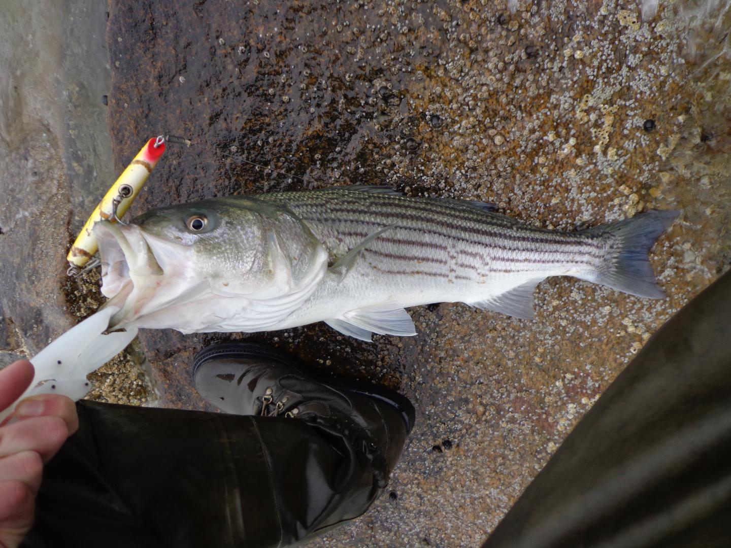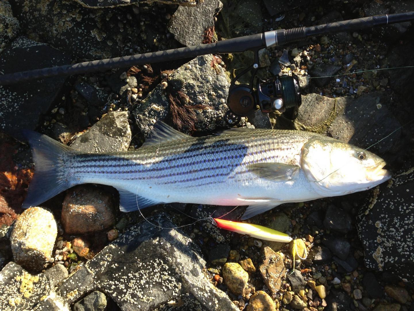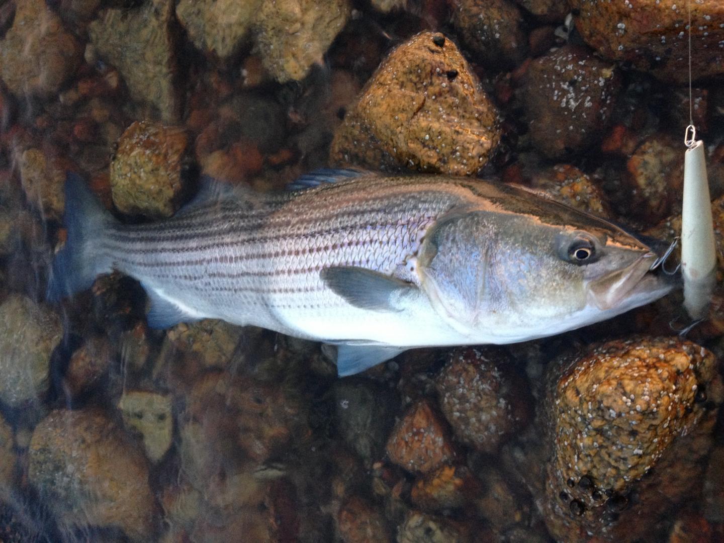 Got this low 20ish fish this morning on a 2.25oz skinny pencil in "great white" color scheme. Pic doesn't do the fish justice, but it went airborne several times during the shallow water battle and was a real pretty fish when it hit the rocks.
