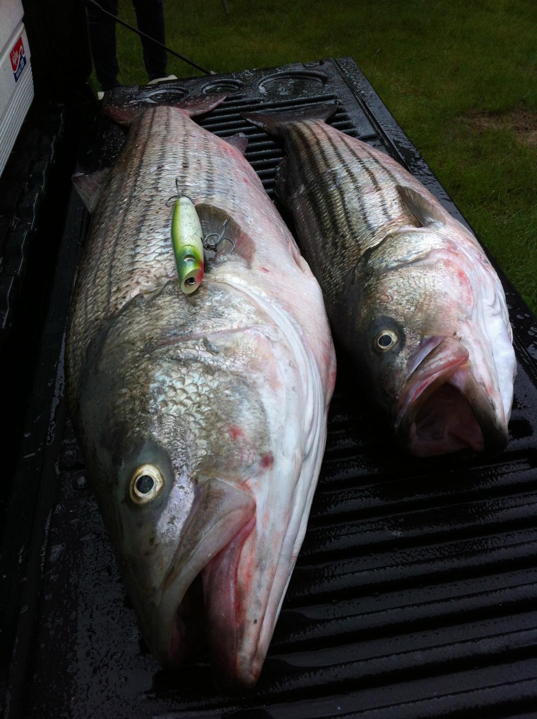Shade over 33 pounds on one of my medium "Double Shots" in a Creek Chub Silver Flash! Also a 14 pounder I caught and kept first for the table........the biggun is for the chowdah pot!!