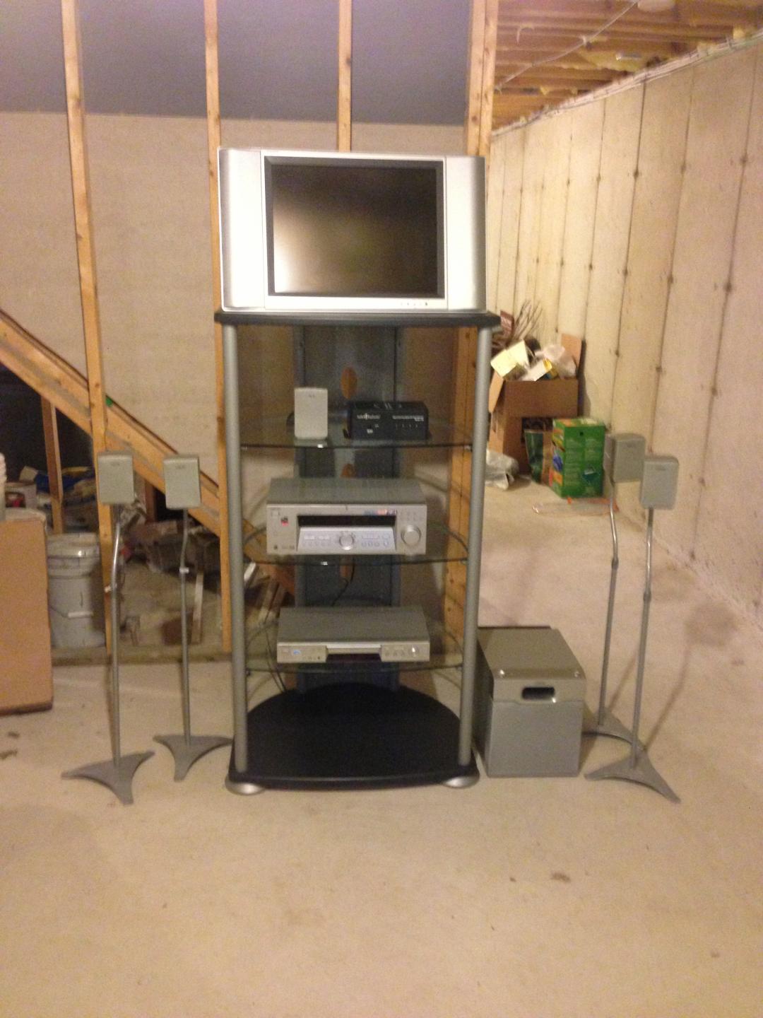 Older stuff but in new condition. Looking for $300 OBO. The stand was more than $300. Stand, Sharp Aquois LCD high def flat panel, DVD player, Receiver, 5 speakers, subwoofer. The tv is connected to a swiveling wall mount, don't have stand. Great for a basement or kid's room. Comes with speaker wire and monster cables, component and optical.