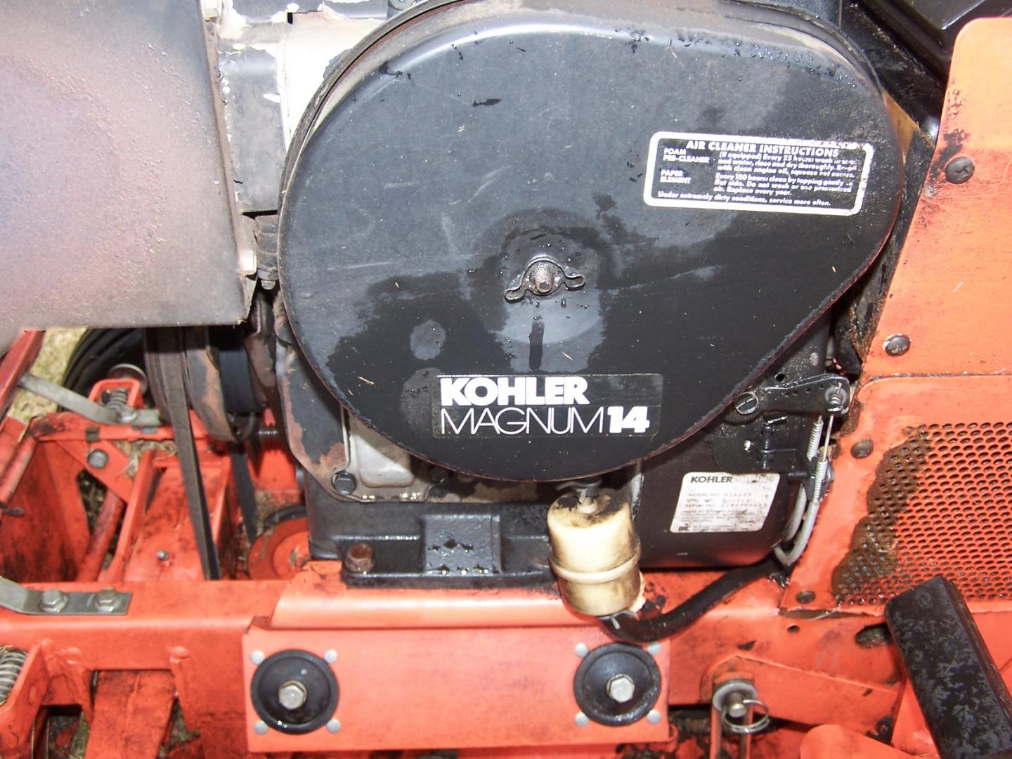 I have upgraded to a new lawn tractor and was going to keep the Ingersol to use just for splitting wood. It has a commercial grade splitter that bolts to the back of the tractor that retailed for $1200.00 when we bought the lawn tractor itself. Now I'm sure it would be substantially more for the same setup. We had cut a deal for the lawn tractor when the owner of the business says a guy bought a splitter from me and he can't handle it. Told me what it retailed for and said I'll sell it half price, so I took it. My wife says after my recent tuneup in the hospital to get my heart running on all eight cylinders I can no longer buy log length wood, cut it to length, and then split it. Aw gee willickers, your breakin my heart. Anyway this tractor has 1078 hours on it, but runs like a top. It has a 14 hp Kohler engine on it. I have replaced the carburator and the fuel pump. The battery is one year old. The neutral switch crapped out years ago so I have to lift up the hood and use a finger to pull up the switch contacts, and then turn the key to start the engine. The mowing deck has some rot, right behind the left front tire(see duck tape), which to the right person who can weld a patch on it wont matter. The seat is only a couple of years old and cost well over a hundred dollars to replace. Everything is hydraulic on the tractor. The mowing deck goes up and down by hydraulics, the grass vacuum works on hydraulics, which bring me to the the most obvious blem on the tractor. That housing for the hydraulic suction/vacuum rotted. It can be replaced, but I am not doing it. I bolted it together better and it works fine, but in a perfect world it could be replaced. I am selling this first and foremost as a splitter. The splitter never met a log it couldn't handle. All the hoses are new and there are no leaks anywhere on the tractor. Every third or forth time using it I have to add about and 1/8" of oil to bring it to full on the dipstick. Oil was changed every 25 hours as called for over the years, and thats why it still runs as it should. I have a bunch of pictures I am going to post with this ad. I am asking $650.00 for the tractor. It cost almost $5000.00 twenty years ago.