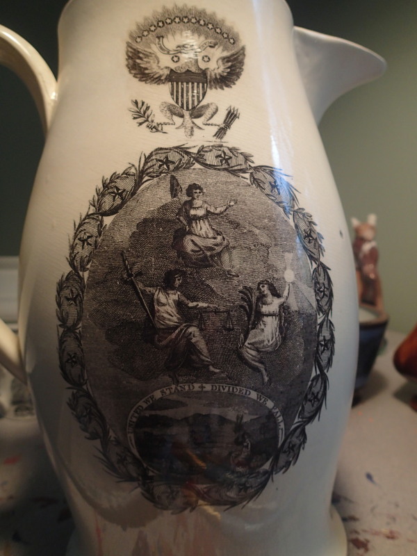 values, rights, entitlements, aren't they just created out of thin air now a days to fuel political ambition? Varying definitions of truth, justice, liberty to suit one's needs rather that to form a common understanding and a stable environment in which to thrive. Communities are as torn and divided as the family unit as values are degraded and destroyed, transformed....this is an image on an 18th century Liverpoool jug that I'm restoring, made for the American market shortly after the Revolutionary War. Symbolic of what the framers intended and understood.....the Great Seal of the United States sits atop a foundation where Lady Liberty resides above Justice and Truth, below is a vignette with fields being plowed(the land of plenty) and a warning above which reads (united we stand + divided we fall)....this is not complicated...we cannot have individual liberty without a basic understanding and agreement on both justice and truth......without those, liberty fails, America falls.......it's the "responsibility" that is required with exercising our inalienable rights that allows us to live side by side with others enjoying without having them taken away, it's when neighbors claim special rights(positive liberties) for themselves, create their own "truths" through shifting sand thinking and engage in arbitrary justice, and acknowledge no responsibility as we can see in our history , we end up in struggle rather than peace....modern, newly created rights, privileged and entitlements, arbitrary justice and shaded truth don't appear to require any responsibilities beyond supporting the correct cause..........