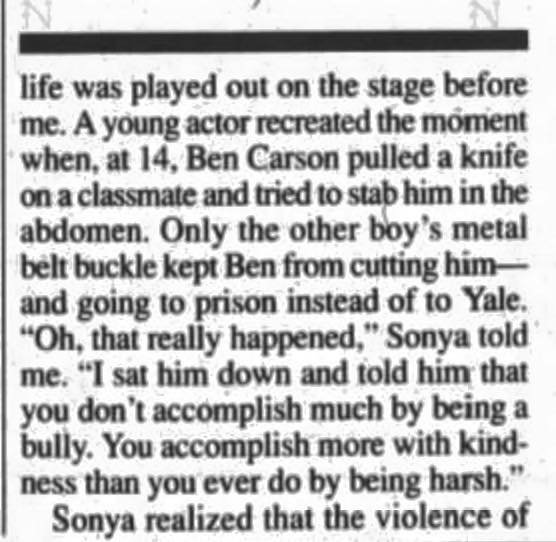 ..regarding the "stabbing story" that was made up, Carson's Mom, Sonya, who is apparently also a liar confirmed the story back 1997 in a Parade Magazine interview on May 11, 1997 while watching the play depicting the his story in his book with the author of the article...