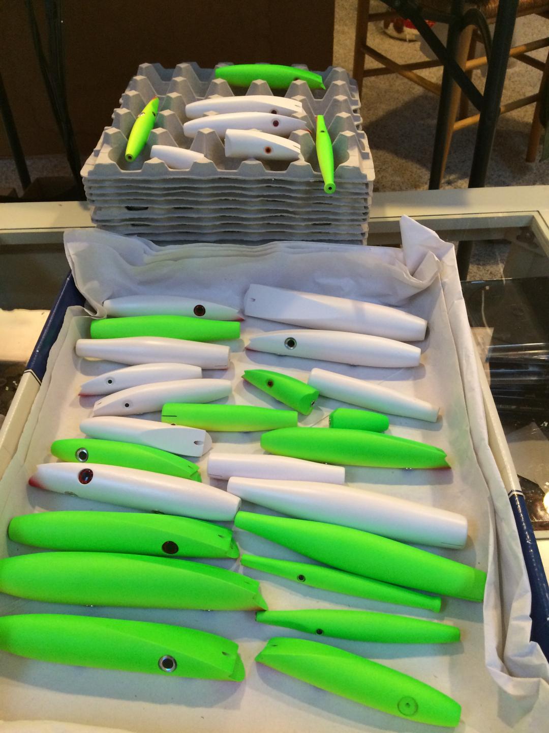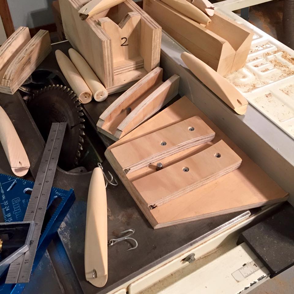 And then start drilling weight and hook holes on the 50-70 plugs I turned a month ago, mostly Donnys and wadd needles and some odds and ends like super skinny pencils and some metal lips