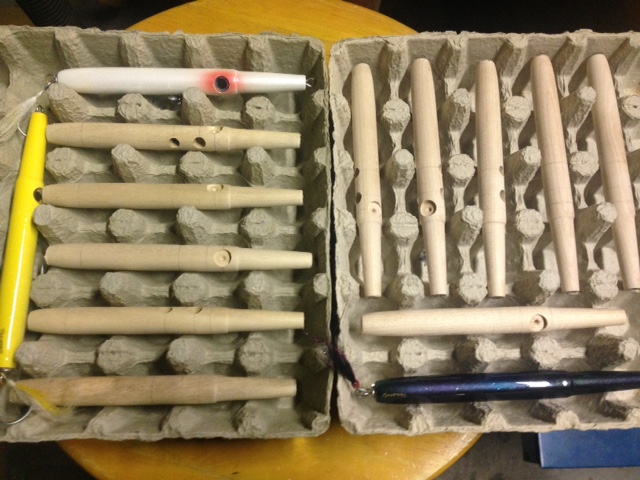 I missed sunday morning post but I've been continuing on my jerk bait project. Made a dozen more, have them sealed, wired and sanded now.
