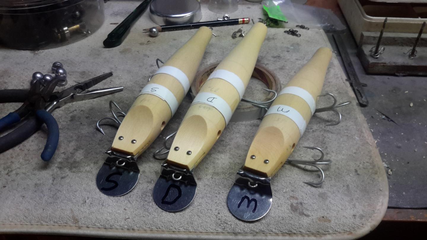 Taking these 3 big girls for a swim today. Have to test the surface and mid diver. The deep will go along for the ride. Had requests for shallow running pikes. The surface wood is 54grams w/14grams of lead, mid is 65grams w/22 grams lead and deep is 85 grams w/ 28 grams lead. Have weights ringed with white electrical tape to facilitate changing. Going to try staggering and mixing front to back also. If I can get the surface one to swim with the heavier weight in rear hole, this should help casting.