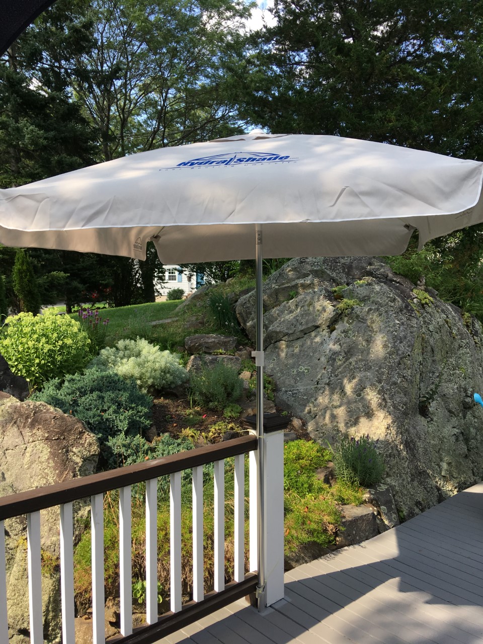 Hydra Shade boat umbrella. 8' open. Tilts. Bought two years ago and took out of storage bag to take pictures. Never went on boat and boat not going in this year... Bottom base locks into rod holder securely. Paid 175 shipped Sell for 100, meet up or plus shipping. Does not have sand screw shown on website