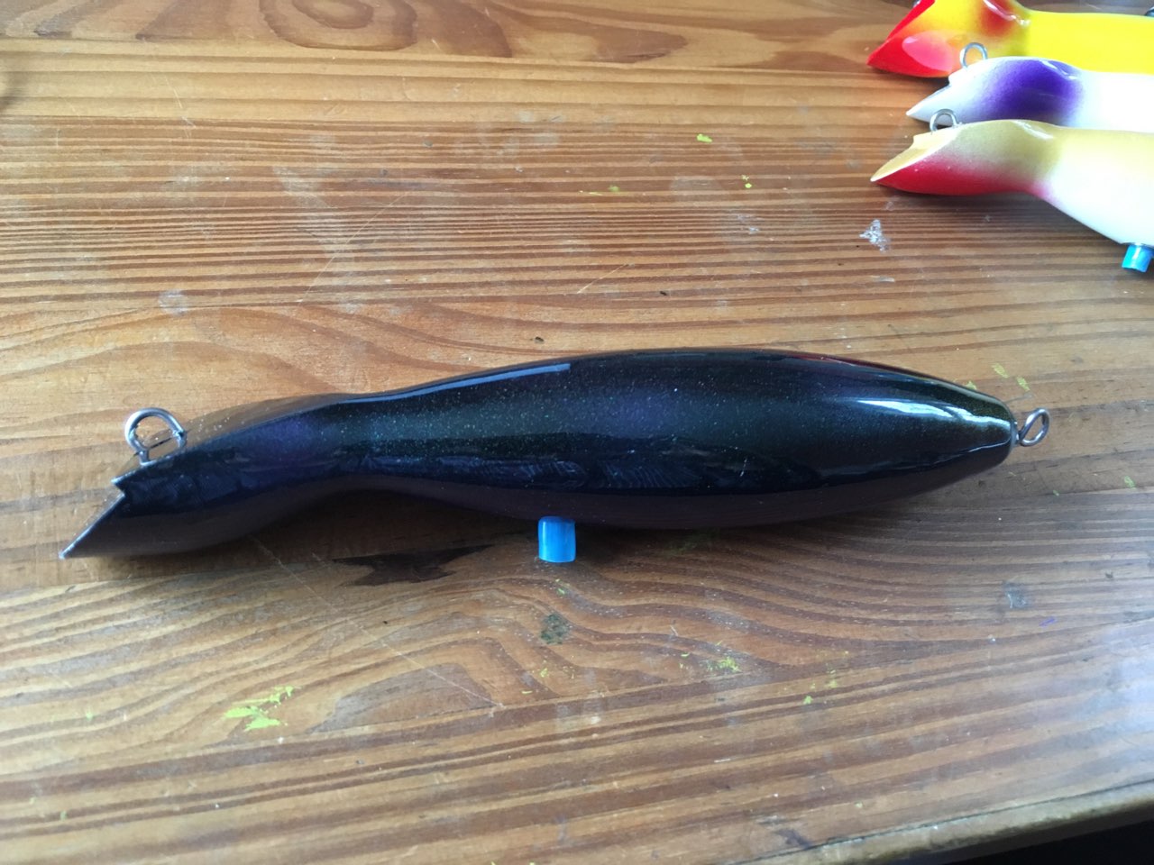 In the pic, the top one is ayc, which worked well but eventually the nose would bust open from contact with rocks. The second and third from the top are last year's mold, when I cast that mold I suspended the plug in my mold "box" and poured the silicone to mid-line with the intention of a 2 part mold. You can see on the green one all the air bubbles it trapped in the mold, and thus every plug I made was a one sided rough-side lol. The bottom one is the new mold, and you can see the small white spot on the base of the plug where the pliers are just ahead of the swivel... that is the original swivel position. In the new mold I simply added another swivel location.