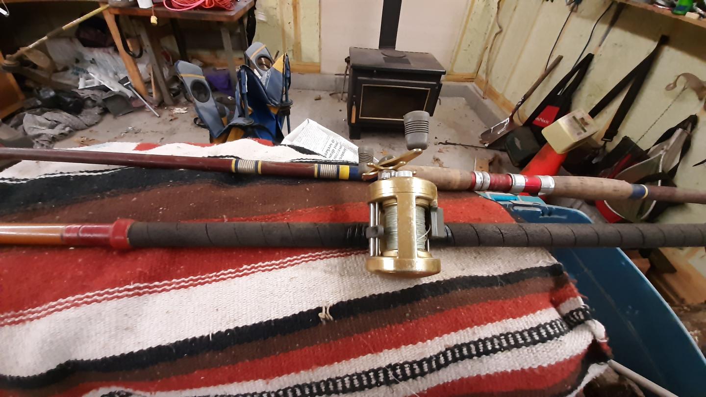 10' conventional wrapped in the early 70s. Old school, no reel seat. Taped on. Calcutta 400 loaded with 60# PP Slick.