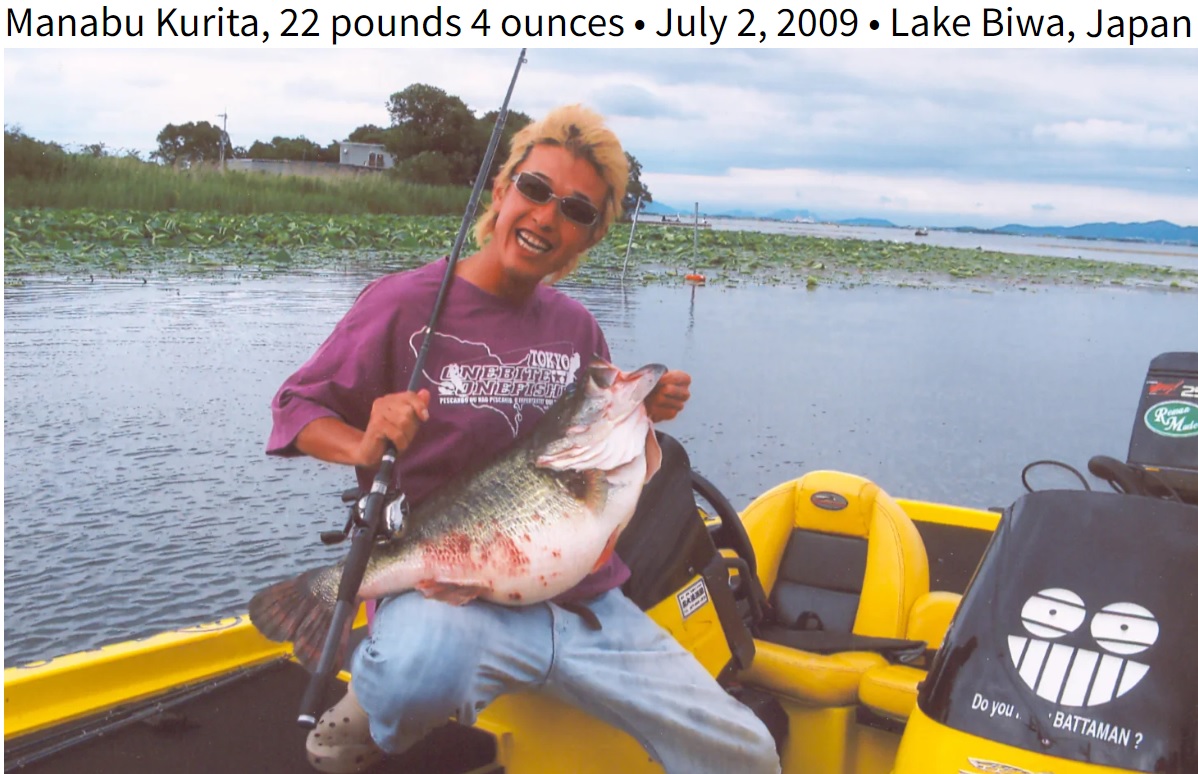 "Japanese angler Manabu Kurita shocked the fishing world in 2009 when he joined Crupi and Perry in the 22-pound club. Fishing on Lake Biwa, in central Japan, with a live bluegill, he caught the 22-pound 4.96-ounce largemouth that now shares the all-tackle record with Perry.
