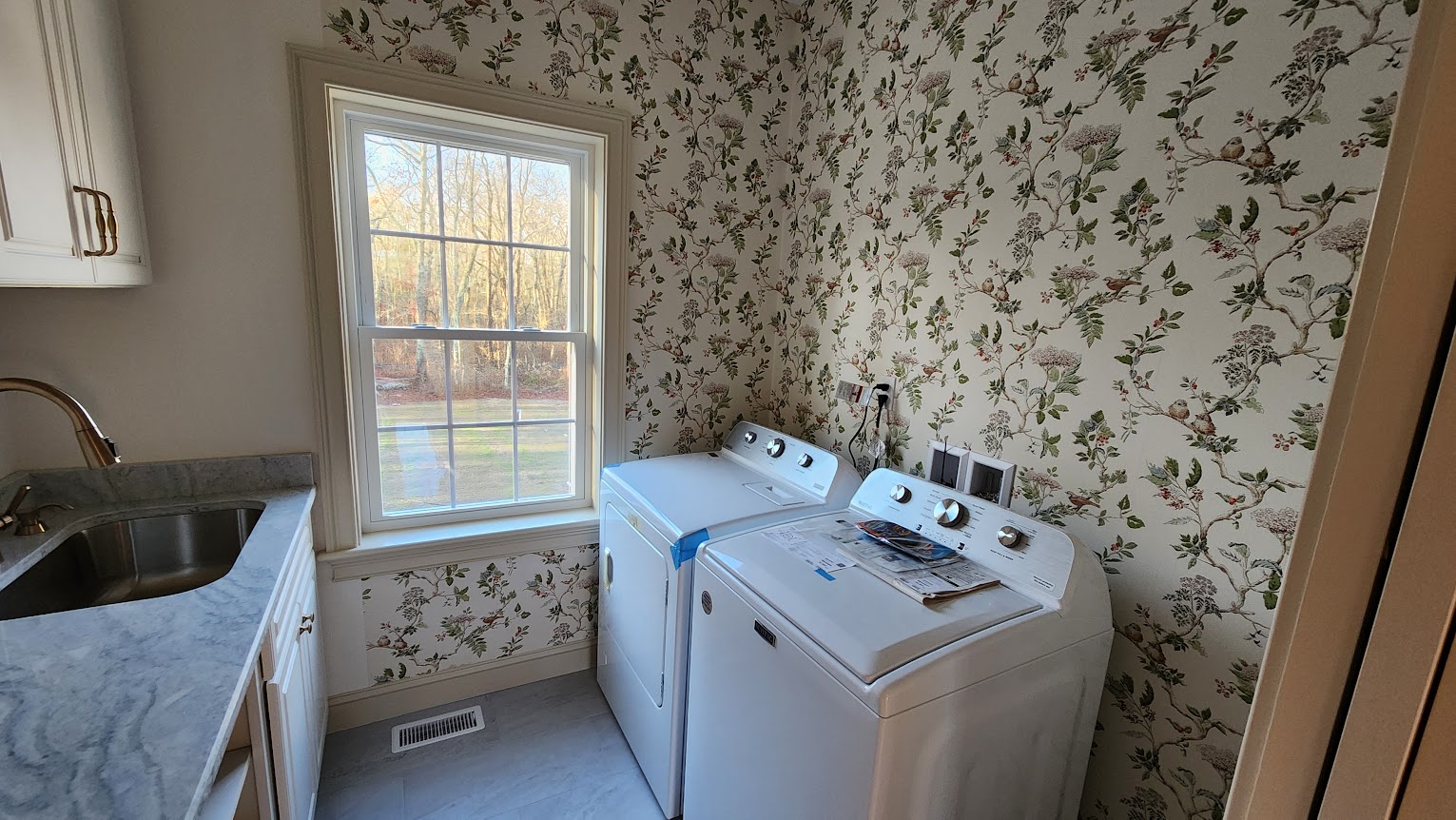 Nice details, that wallpaper looks spendy, not many people use it any more. I do hope that old brass finish ceiling fixture is temporary.
