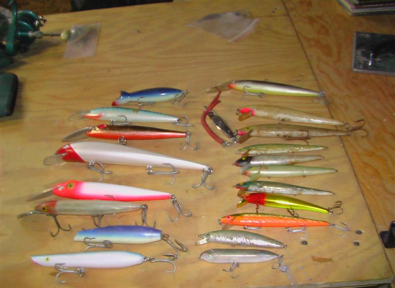 Rapala Jaw Breakers, Nils Master, baby redfin, heddon hellcat, large rebels, gags darter, cordell pencil, gibbs bottle, cisco kid.