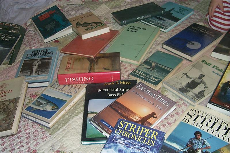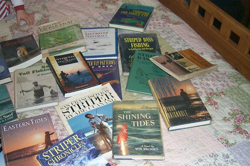 Two different volumes ( original and updated ) Woolner and Lyman "Striped Bass Fishing", 1872 Edition "Fishing in American Waters" by Genio C. Scott, "Make your own Fishing Lures" by Vlad Evanoff, "Striped Bass Fishing" by Ollie Rodman, "Twenty Years on The Cape" by Frank Daignault, "Fly Fishing in Saltwater" by Lefty Kreh, "Pop Flys" by Bob Popovics, "Cape Cod Fisherman" by Capt. Phil Schwind and "Striped Bass by Nick Karas" and "A Fisherman's Guide to life" plus Gene Bourque, Editor of On The Water's to fine Guide books, one in R.I. and one on Cape Cod. I have a whole library of fishng books upstairs as well.