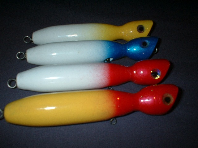 heres a pic of a bluefish popper i just made with brass screw eyes and dowels there very easy and cheap to make.i used a dremel rotary tool to cup the mouth of the popper and shape it i hammerd a nail for a pilot hole beacause i did not have any drill bits small enough i filled the hole with epoxy (you can use slow set super glue) and screwed the eyes in and let them set.use a big bit and drill weight holes near the rear and front of the plug. you can epoxy split shot or egg sinkers in these holes if you dont have a lead melting pot. use linseedoil for sealer soak the plug for 5min and let dry for a day. spray paint it the color you want.