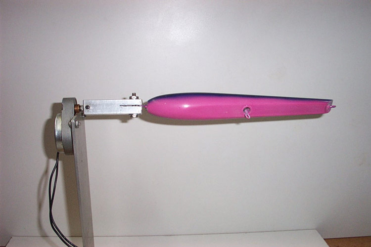 This is a close-up of the attachment I use to spin my plugs. I purchased the motor from Cabela's for $21.99. Any slow rpm motor will work, this one is 4 rpm which is good because I apply the finish while the plug is spinning. I assemble my plugs with weight,swivels and wire before I do any painting or finishing because I don't want the paint carved up while the plug is clamped in a vise twisting off the thru wire, even with rubber pads on the jaws. I hold my plugs by the tail loop of wire with vice grips during the painting process. The attachment was made by a friend out of aluminum but I'm sure one made out of hardwood would be fine. It's about 3/4" square and 2 1/2" long with a bandsaw kerf run 1" into the middle. A small nut and bolt applies the pressure to hold the plug.