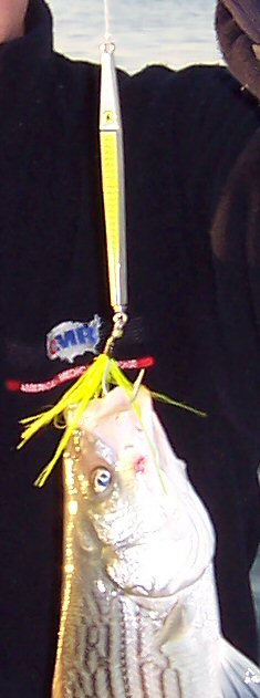 Elmo's first cast with a professor Moriarty metal, stripers and blues were breaking the surface alll morning while we were there. Not a big fish, but a fish none the less.....