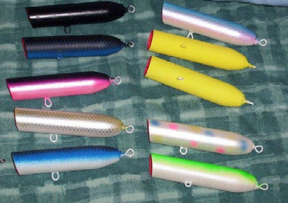 The poppers are 4 1/2" and sit almost vertical with the nose barely sticking out of the water(in the sink anyways), the sorta surfsters are 5 1/2" and weighted in the nose, the pikies are 6 1/2" and also have a shot in the nose. The two dannys are 5", with one being skinnier(only about an inch in the middle) than the other. The poppers are poplar(kinda rhymes!) and everything else is red cedar.