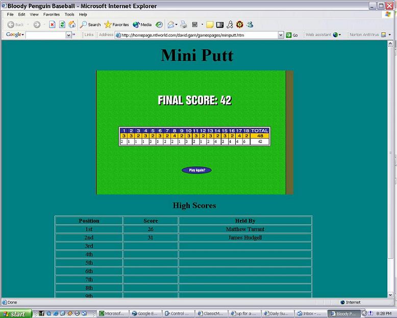 AF, on the 14th, you tee up in the upper left corner and shoot for the top of the dark brown section. The angle is correct to bank it in the hole, its just figuring the power. I use one dot less than actually touching the brown border