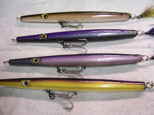 A few to liven it up. The strange one is an upsized knockoff of a Pfluger plug called a Tantrum minnow. Didn't get it right and haven't swum it yet, but what the hell, always fun to try something new.