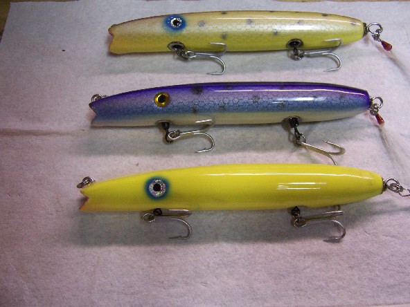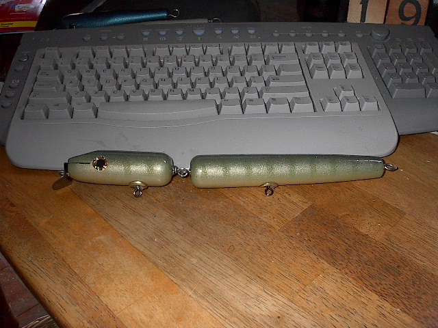 Used pine, since I think that's what the Gibbs were/are. Weighted them along the wire, all the way to the front hook. Not sure I have that right yet, but I'm getting closer. Got a few AYC as well, and have been thinking about trying maple........either of you guys any experience with maple bottles?........made one a couple of years ago that was a dud but I think I had the lip wrong then. I also shaped these more along the lines of a Musso than a Gibbs, the latter which has the shoulder closer to the neck, I'm starting to think the Gibbs shape may swim better. Along the same lines, here is a weak knockoff of a Musso littleneck swimmer (after I got outbid by a ton for one on ebay)............same shape as a bottle, but the weighting is a mystery so far.