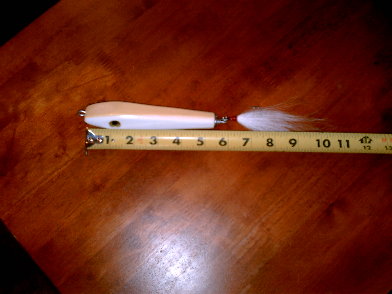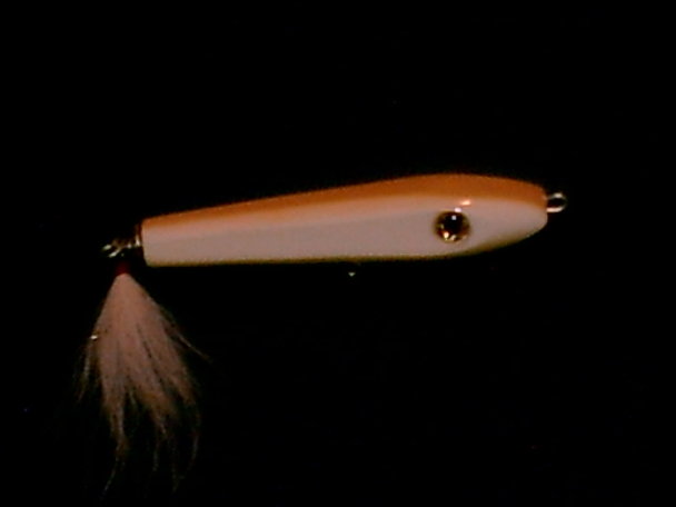 Cool stuff. Very simple but subtle at the same time. Darter planes top and bottom, tapered body with big head to get some sway, bucktail for a jointed effect. Do you weight them so they sink close to level, slightly tail down? Looks like you might be onto something good there.