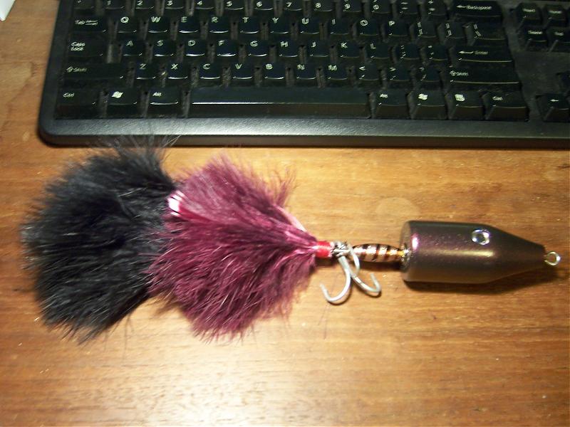 some musky influence. still needs epoxy and a rear hook. no clue what this thing will do. body is AYC and has a tailweight in it. glass bead from the craft store. stainless coils with marabou and bucktail. I used a split ring on the front hook since I don't have any longer shank hooks.