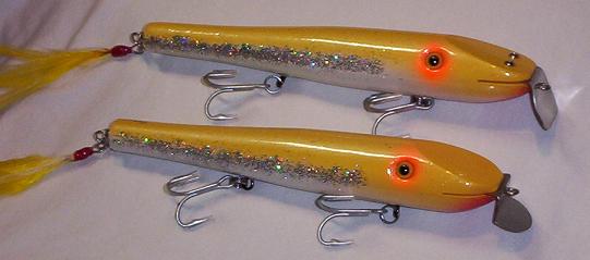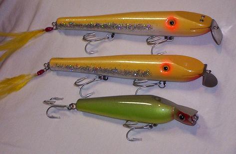 some past promises .. take me all winter to catch up .. knocked off a couple of Chumbuckets.. This is a long slim plug 8.5" ,, I've caught some smaller,, mid size fish on it ,, nothing large yet .. I don't care if it catches .. I throw this one for myself ... swims really nice .. I keep making this plug to fish and give others the experience .. chances of landing a real Chum are slim ..Trying a surfster lip proto. very rare... Shown with 6" predator..