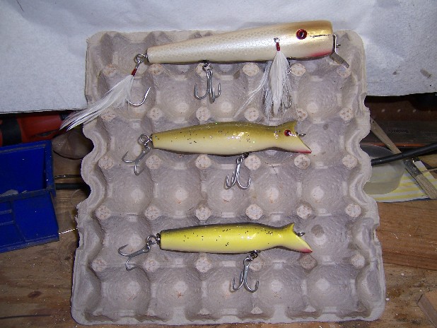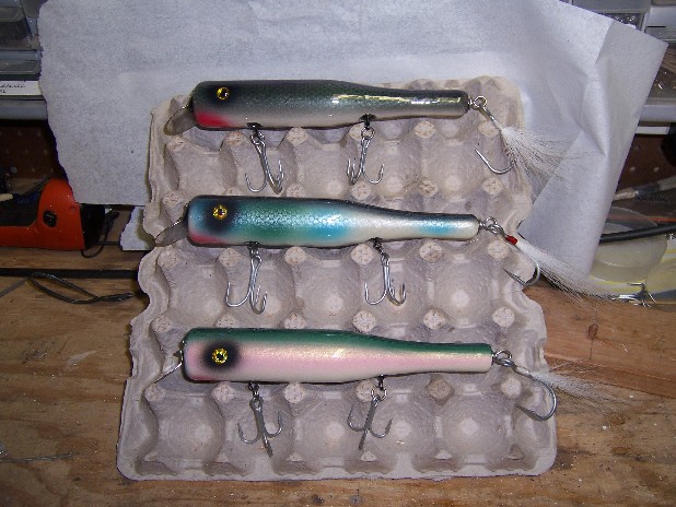 I've been busy for sure, lot's of stuff still "curing" I'll be painting all this week.. I've got three sizes of needles, three sizes of pikies and surfsters, 40's and eel skin Jr. as well as some "tricked up" Copies of Capt'n Bills swimmers all to be finished...