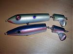 The one pictured is not mine. That one looks like it was made for musky with the two belly hooks. Several commercial manufacturers make one like it. Most use screw eyes in the front section. Mine are thru wired in both sections. Besides myself, only the Professor and #^^^^^^^^^^^& have one one of mine. Tail spins and kicks up the water. Move it like a dying bunker to slay the bass.