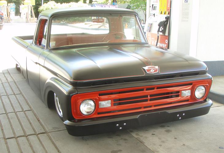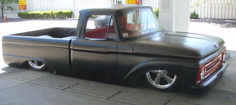 Just some pics of a kids truck at the gas station . Took him 2 yrs. working on the frame,, all orig. drive train .. World of Wheels winner 2 yrs. Truck is sitting flat on the ground .. He says thats his emergancy brake .. Aired it up and left ...