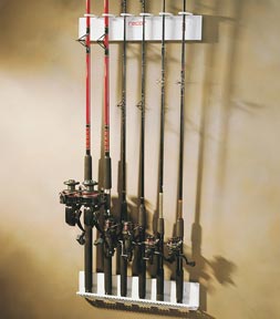 Epoxy covered steel. Holds six rods. New, never mounted, in box, box stored in dusty shop. Retails 45-53.00 Asking 35.00.