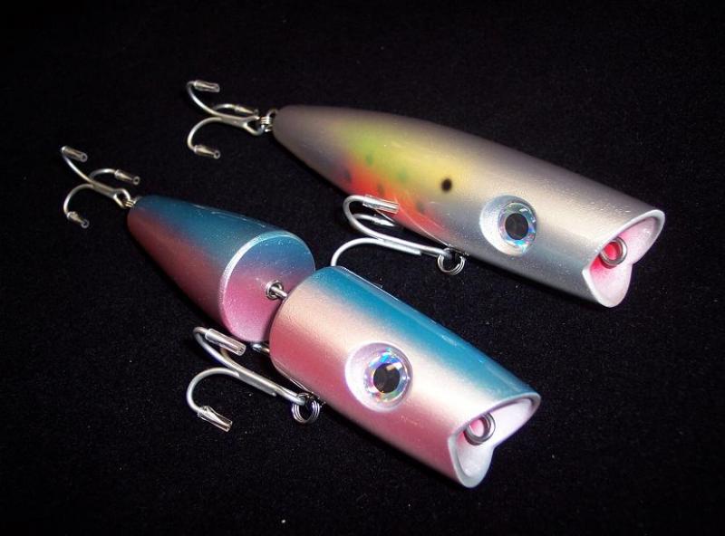 I made these poppers for the canal. The jointed herring is 6.5 inches long and weighs 3 oz. The bunker is 5 3/4 inches long and weighs 3 oz.
