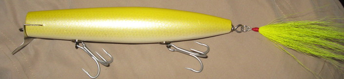 that's a great looking frog! I just got back from the pier, there was a nice little current moving so I was able to see my plug in action, I've been trying make a realistic eel in a large jointed needle despite what I read in the archives about the uselessness of jointed needles, I drilled out the inside of the back section and filled it w/ shot so that it's ass heavy and casts great then levels out in the water, the head section is smallish and wiggles side to side with tiny twitches, looked very convincing as i watched it from above on the pier as the current carried it....I got the micro scales done this weekend and will probably paint the features tomorrow....Dad, I wiil have a difficult time separating this from my hand...but I hope ya love it!