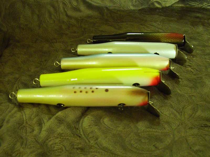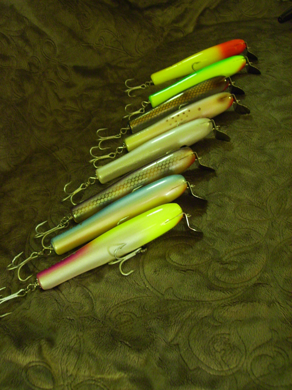 Here are the 3oz Darters. These run about 5 feet deep and their darting motion is not wild, it's more of a searching baitfish looking swim. The action is dead-on to the original Pichney Darter.