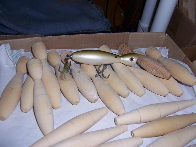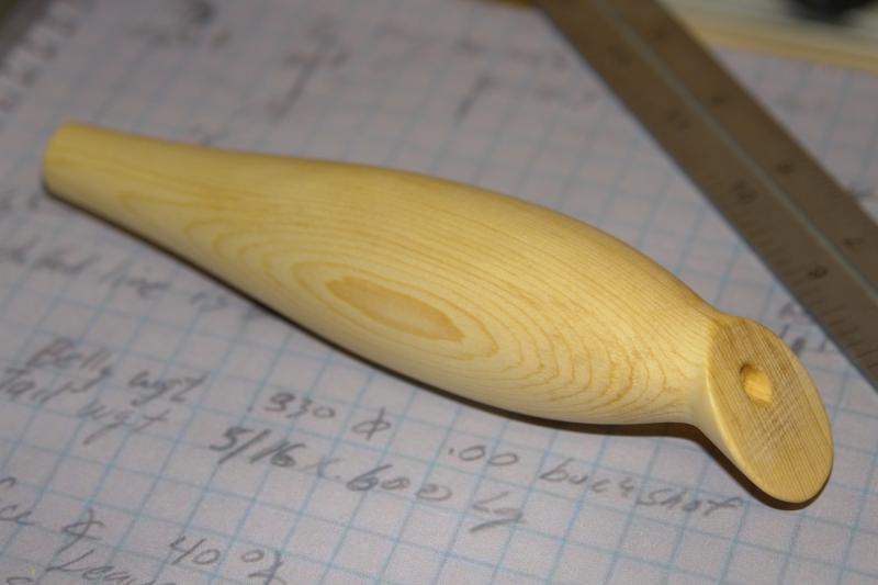Lu. This weighting works great. My buddys love the way it casts, fishes and catches. The weight is a 1/4" lead rod 3" long. Approx. 1oz. Pix of blank b/4 turned and a finished turning. A 1/4' dowel is glued in the drilled weight hole b/4 turned.