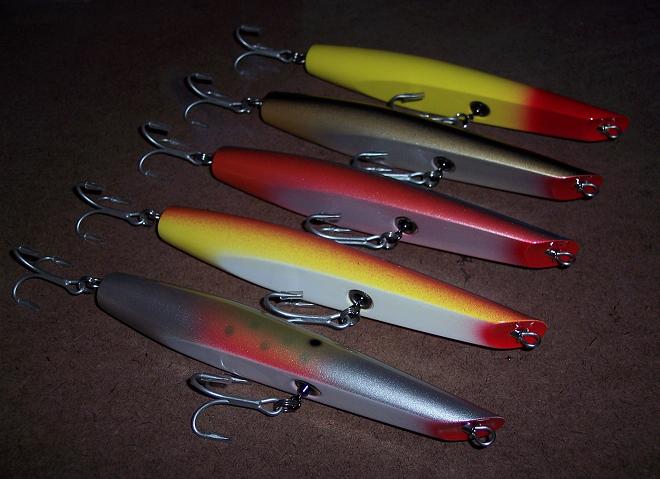 These are a very short limited run of Canal Pencils that I just finished! They are 7 inches long and weigh 3 ounces! 3/0 VMC's and triple split rings! These will not be available in shops this season....but they are available right here on S-B!  They cast a mile and are a striper slayer! They sink, they do not float! I took these down the canal last week (I have never caught a "Canal Keeper" before....many of you know the Canal and I do not get along!) I probably caught at least 10 keepers between 15 and 26 pounds......lost a "Bunker" pencil to an absolute "SLOB"! It slurped the pencil down and ran like a freight train.....I never had a chance! So look for the 40 pounder+ with a "BigFish Bunker Canal Pencil" in its maw! These are priced at $23.00 each plus $4.00 shipping! Colors are as follows!