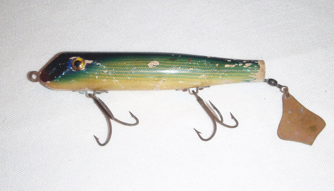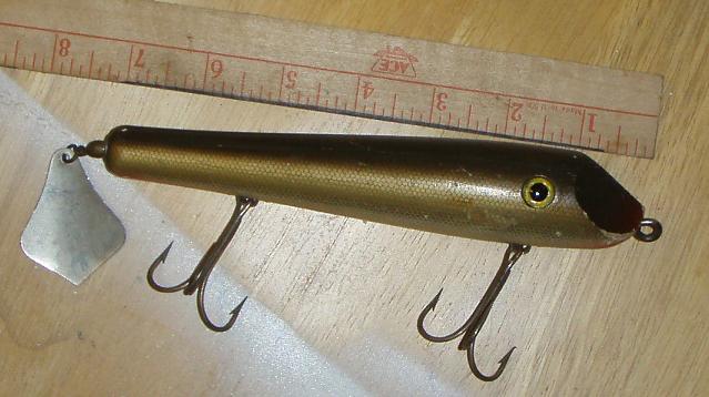 Very nice plugs Tagger. Here are some pics of my Sylvester Flaptail for comparison. Your rigging is slightly different. On the original the swivel is actually screwed to the bottom of the plug into a countersunk spot.