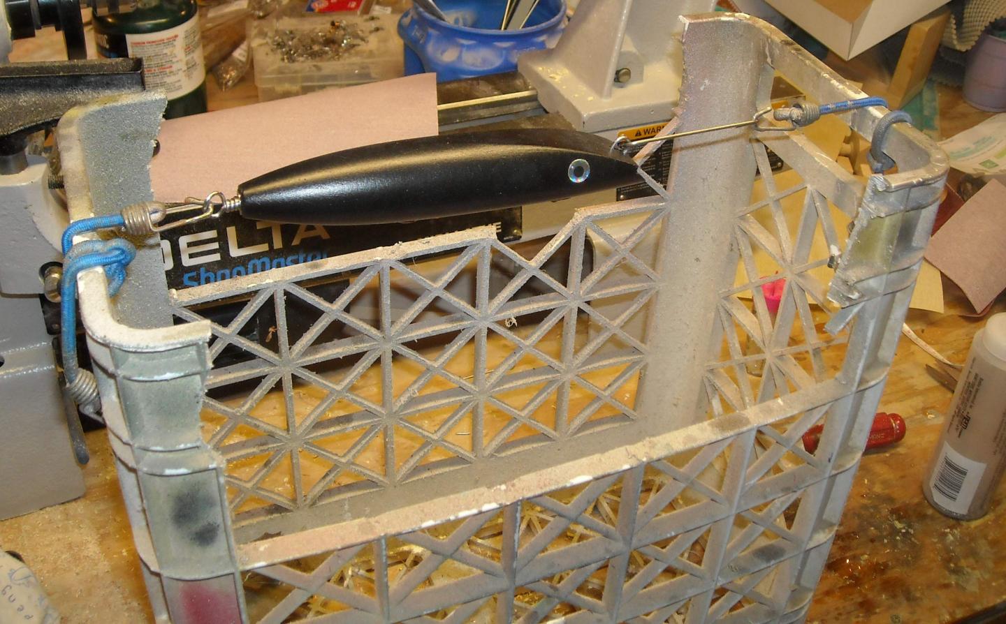 being new and contributing nothing yet, this may be a first! i have been getting epoxy-horses (where muscles in thumb tighten up) from holding my plugs as i hold and spin with my hand! today i have 25 plugs to do and i came up with this myself (although i am sure many do the same thing) to relieve the pain. it is a bench top spinner. you need, a swivel wired to an eye hook mounted on one end. the other end of swivel connects, via wire, to plug eye. to the tail end of plug is a stiff coat hanger wire, connected to a decent sized pair of vice grips which hangs off the edge of bench. as you epoxy you re-adjust where the vice grips hang. next step is to the drying box! if this even helps one person, i finally contributed something here besides questions!