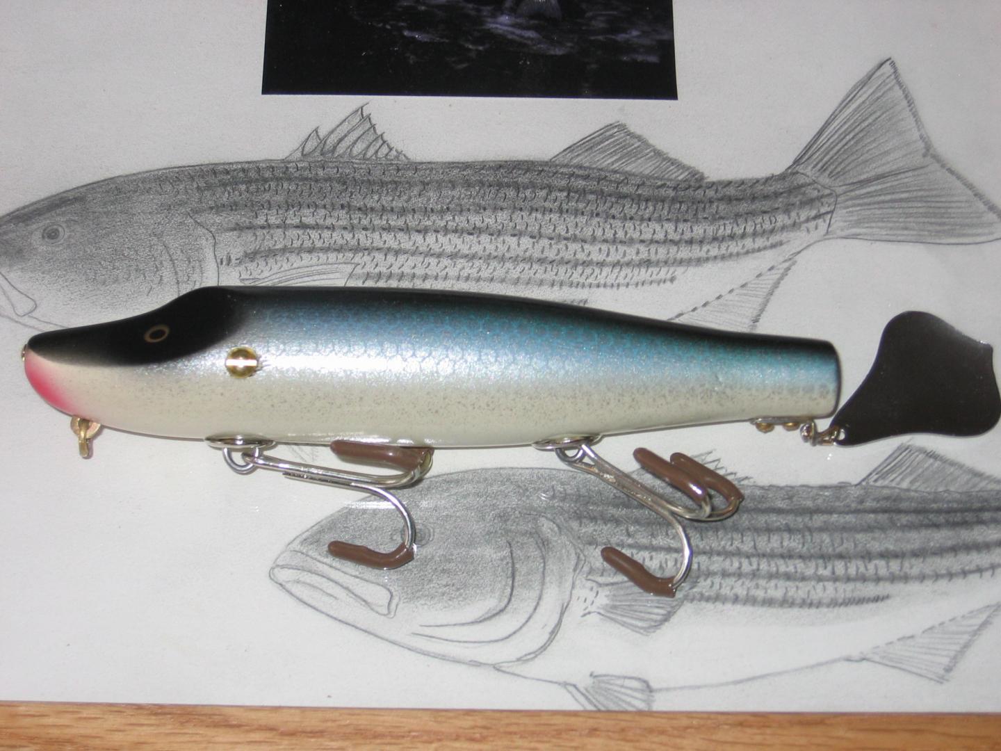 Like angler220 (very nice to meet and chat wtih you) I also took a shot at a Bernie Myers plug. I have always liked the body style and figuered it was a good time to give it a try. I was actually able to get a couple to use as a reference from a nice guy down the road in Shrewsbury. What's interesting is that from what I read and pictures I saw there seemed to be two body styles he made. Of course the guy in Shrewsbury had both! If you look at angler220's plug its dead on to the bottom plug...Mine the top.