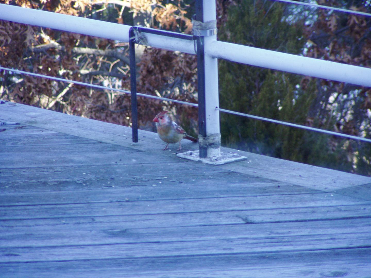 Snow Cardinal....his dad must be a snowy owl? Molting to summer colors...