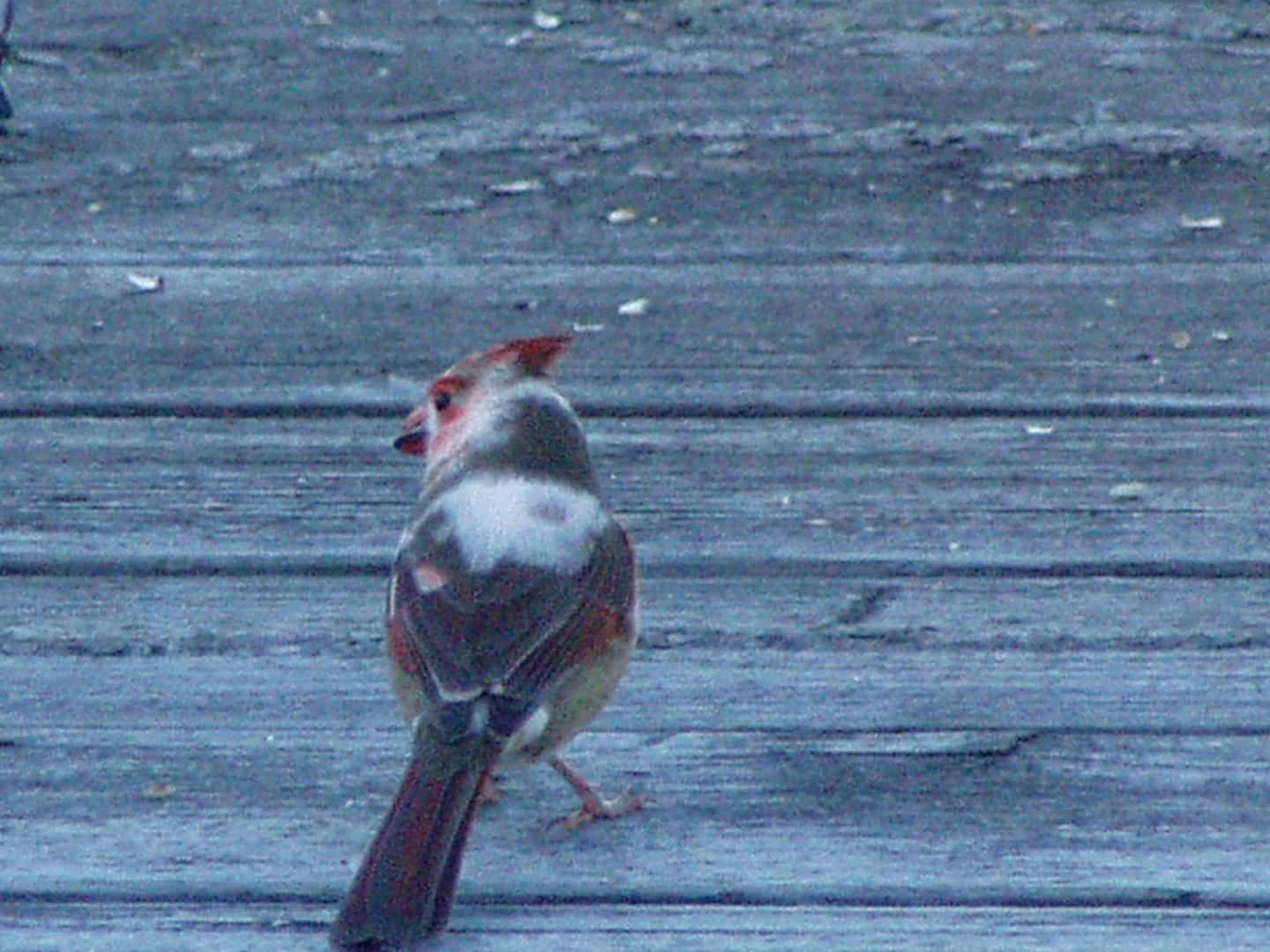 Snow Cardinal....his dad must be a snowy owl? Molting to summer colors...