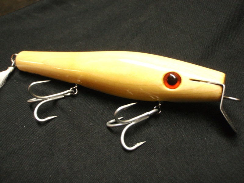 Here is one of my schoolie-ish clones I call The Muskrat (the ones rigged with the Lefty 2 that dive deep I call The Weasel). With a Lefty1 bent down and the lip bent down it will swim no deeper than 3-4" in calm water. It pushes a wake much like a tuna does when swimming just under the surface, and at super slow speed it swims 'in' the surface, as opposed to on top of it or below it as a danny does. I have high hopes for it.