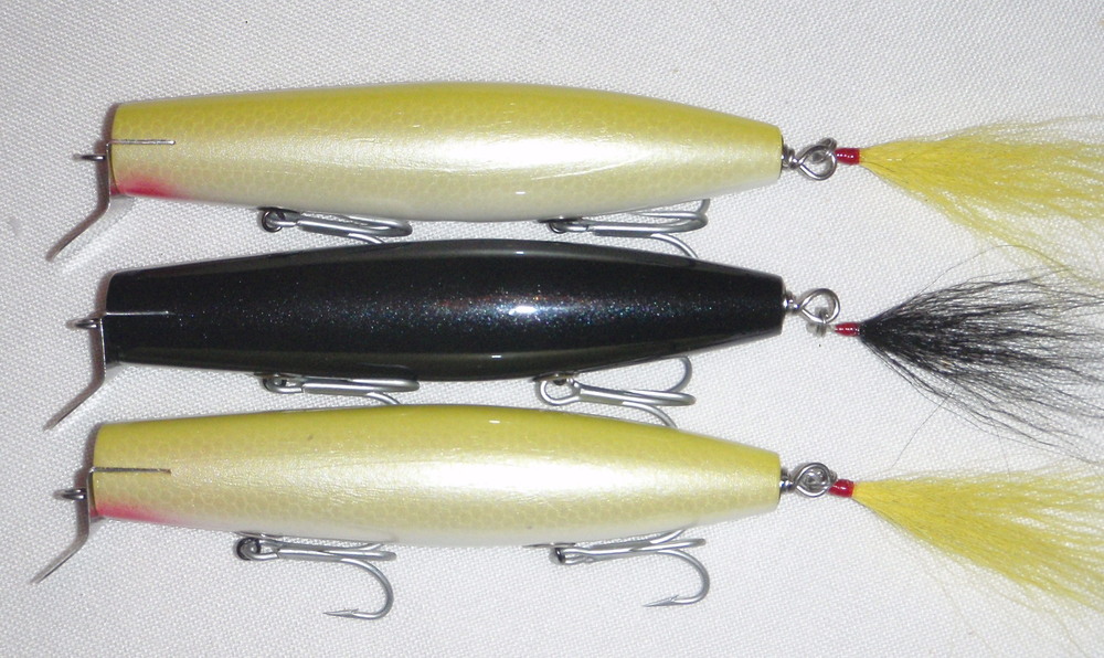 SKS came down the other day so I could give him an intro to using his new airbrush. While doing some demonstrations of different techniques I finished up these plugs. First picture are some Musso Juniors top two are Pines and bottom is a Surface Swimmer. Finally have some to fish myself after I managed to give/trade away all the others I made away. Next is my version of a Junior 6" 2.4-2.5 ounces and finally a prototype large surfster 7.5" 2.9 ounces.