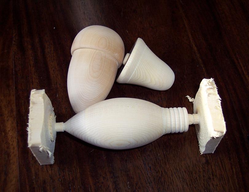 all turned,sanded,scooped,belly holes,lip stolts,thru drilled and eye holes.