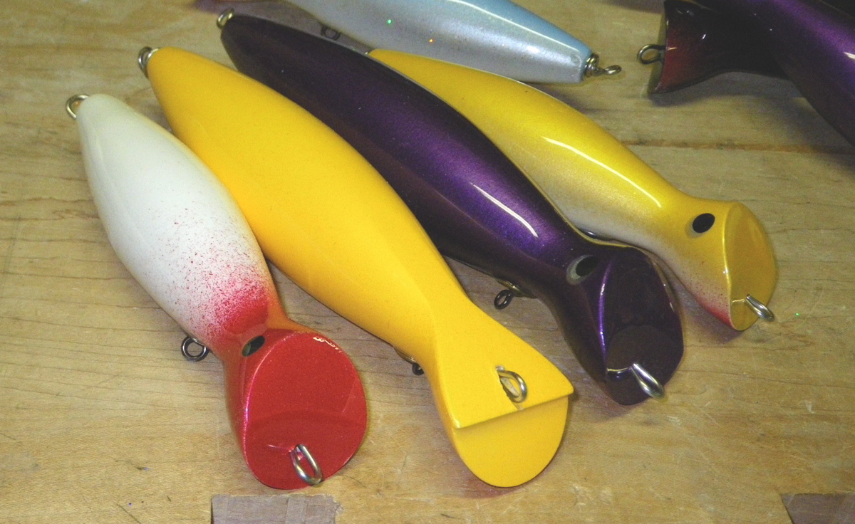 FYI, don't copy the face shape of the top yellow plug in the picture. It was a miss-cut that I finished to try, but was a dud. It lacks enough lower face vertical surface area to swim. Here is a photo of an original Musso