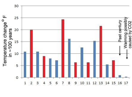 Figure 2 shows comparisons of the largest magnitudes of warming/cooling events per century over the past 25,000 years. At least three warming events were 20 to 24 times the magnitude of warming over the past century and four were 6 to 9 times the magnitude of warming over the past century. The magnitude of the only modern warming which might possibly have been caused by CO2. (1978-1998) is insignificant compared to the earlier periods of warming.