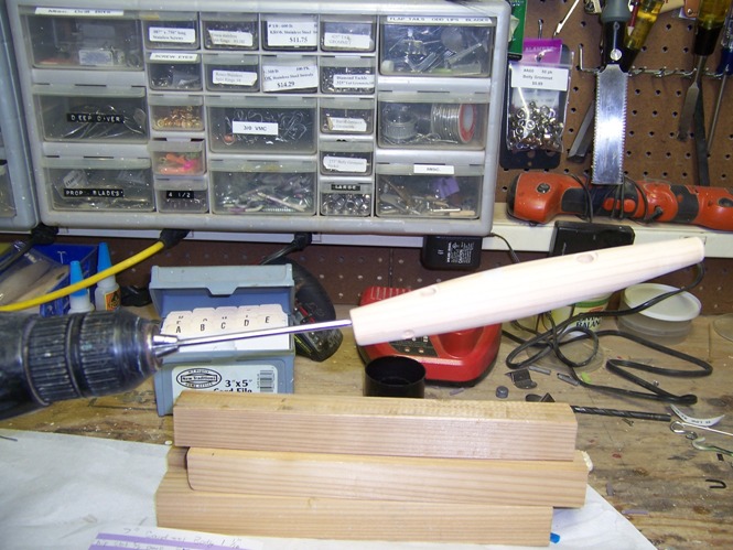 For me, it starts with a need... in this instance, the need was for a slim profile swimmer... the idea, like most idea, was not/is not new.. or mine originaly, in this case, Danny Pinkney inspired the idea long before me, I liked the profile ( although I've only seen it on line, never in person) ... so knowing roughly the size of the plug I needed, I spun several bodies out of scrap pine....dipped them in polycrylic to seal them for testing , rigged them using cheap galvinized wire and fitted each with a differant style lip... several holes were drilled in the bellies ( one was tail weighted), in differant location on each plug, each were weighted differantly, each hole ( un ocupied) was filled with modeling clay, which could easily removed to change size and location of weight... after swim testing, i settled on a profile I liked, copied it to a template so I could run them on the duplicator and repeated the process again using WRC.AYC and Birch.... after several trial and errors, i settled on the design i now have, using WRC and the weighting scheme...