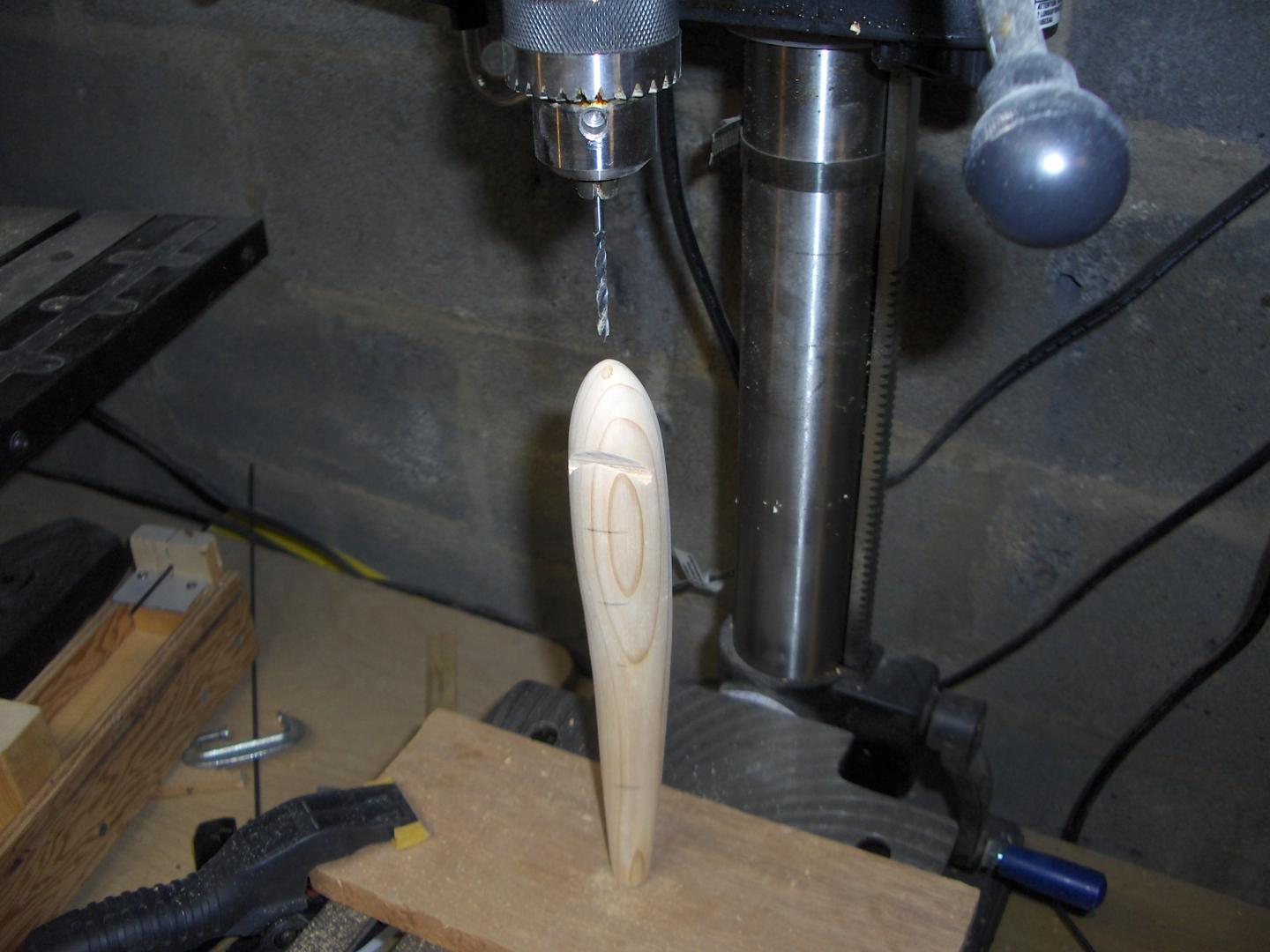 I drill the thru wire hole after shaping the plug using the center pin/drill press method that numbskull recommends, and finish with a hand drill. Learned it from a post by rockfish.