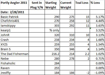 Ok down another 2 pounds, that makes 20 lbs for me although I started late with the portly angler so not all of it counts. I am Soooooooooo HUNGRY!!!!!!!!