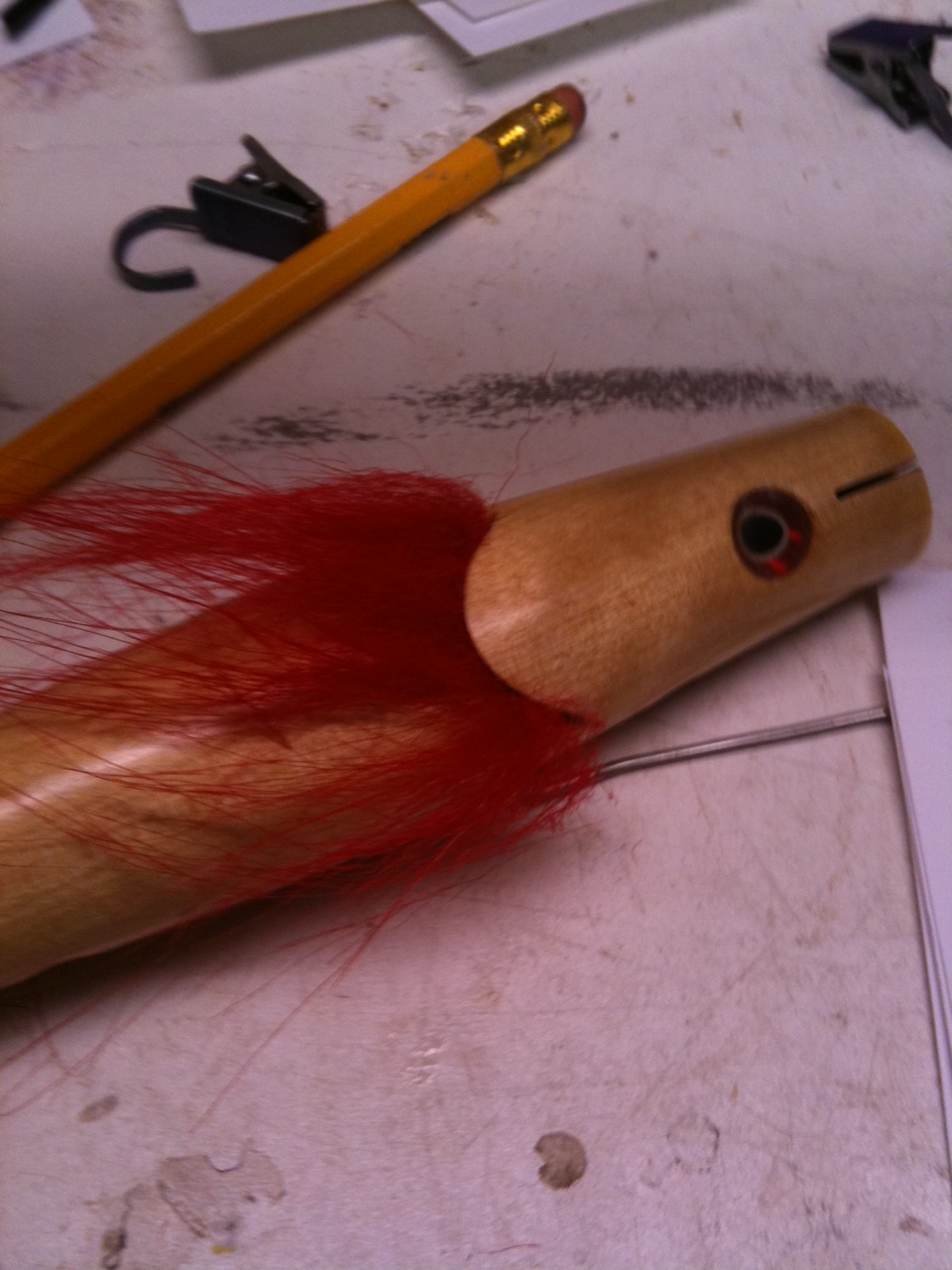 Using a metal lip, push the craft fur into the slot. Let dry and then start to trim.